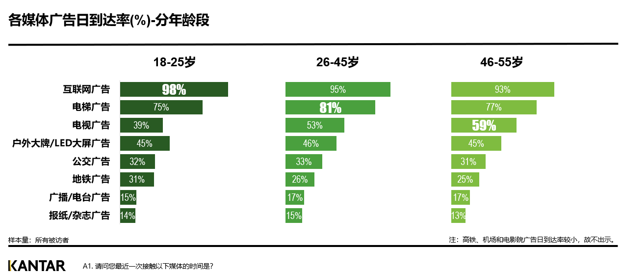 不同类型的广告所覆盖的受众年龄段不同。互联网广告在各年龄段受众群中到达率都是最高的,而电梯类广告则在26-45岁人群中到达率(81%)较其他两个年龄段更高,而电视广告到达率最高的是46-55岁人群(59%)。