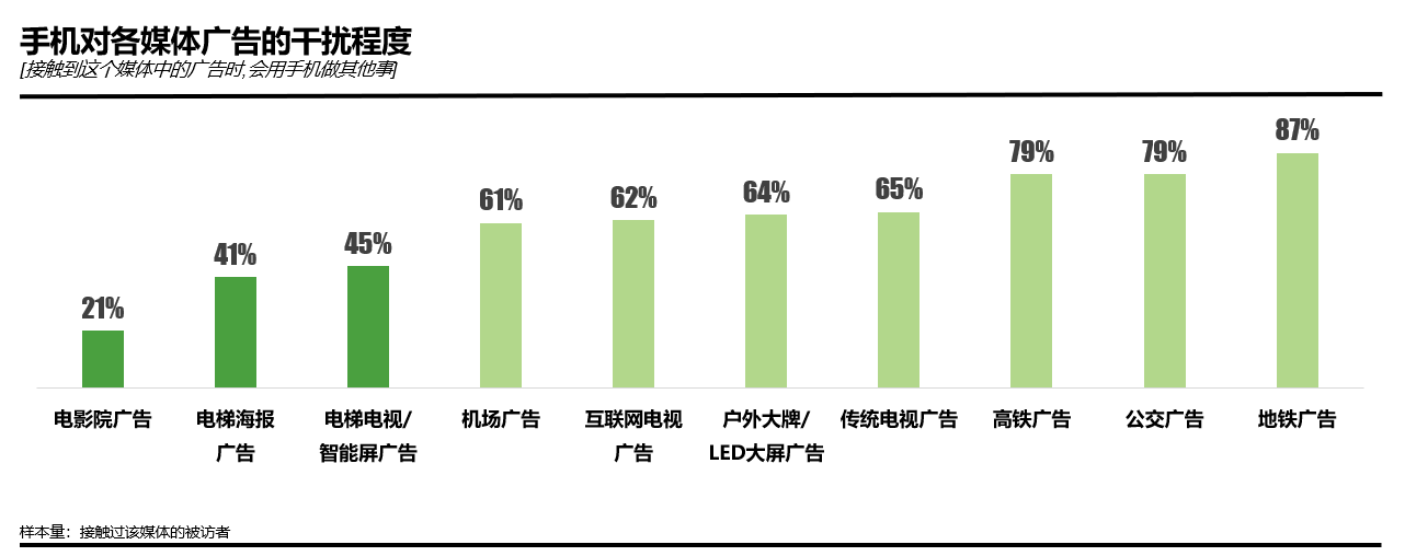 对很多人来说,现在手机已经快成为身体上的一个器官,也成为干扰其他媒介影响力的因素。因此,受手机干扰度越小的媒体广告受关注程度就越高。如手机对交通类广告的干扰度达79-87%,而“电梯海报广告”和“电梯电视/智能屏广告”都是受干扰低的媒体。电影院广告受干扰最低,只有21%的消费者在观看时会用手机做其他事情。