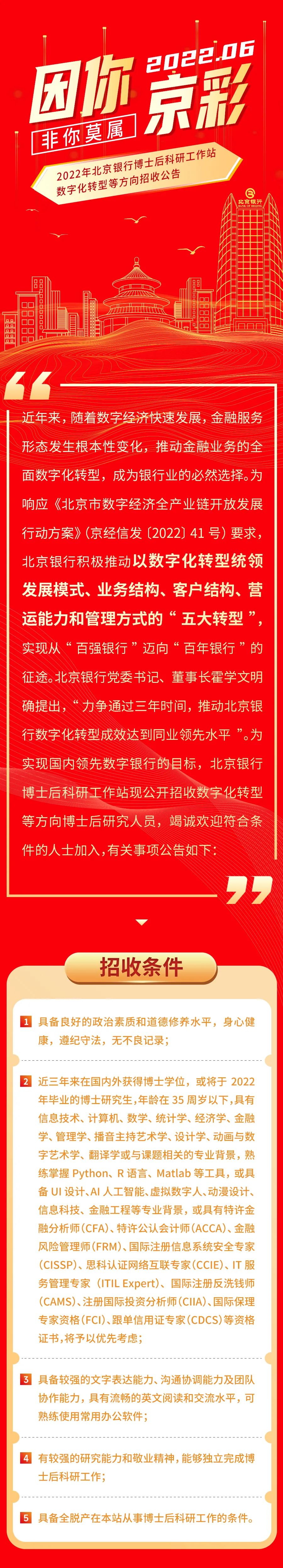 因你京彩 | 2022年北京银行博士后科研工作站数字化转型等方向招收公告