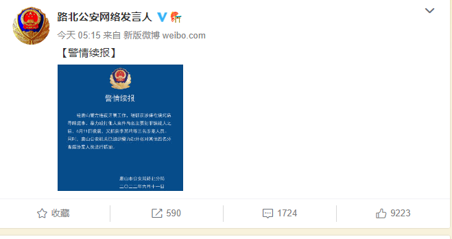 6月10日,一条唐山烧烤店多名男子殴打女子的视频,迅速引发舆论强烈关注,多条相关新闻冲上热搜。10日晚,河北唐山市公安局路北分局发布消息,6月10日发生在唐山市路北区某烧烤店涉嫌寻衅滋事、暴力殴打他人的主要犯罪嫌疑人陈某志、刘某被抓获归案。警方通报称,警方绝不会放过任何一个违法犯罪人员!