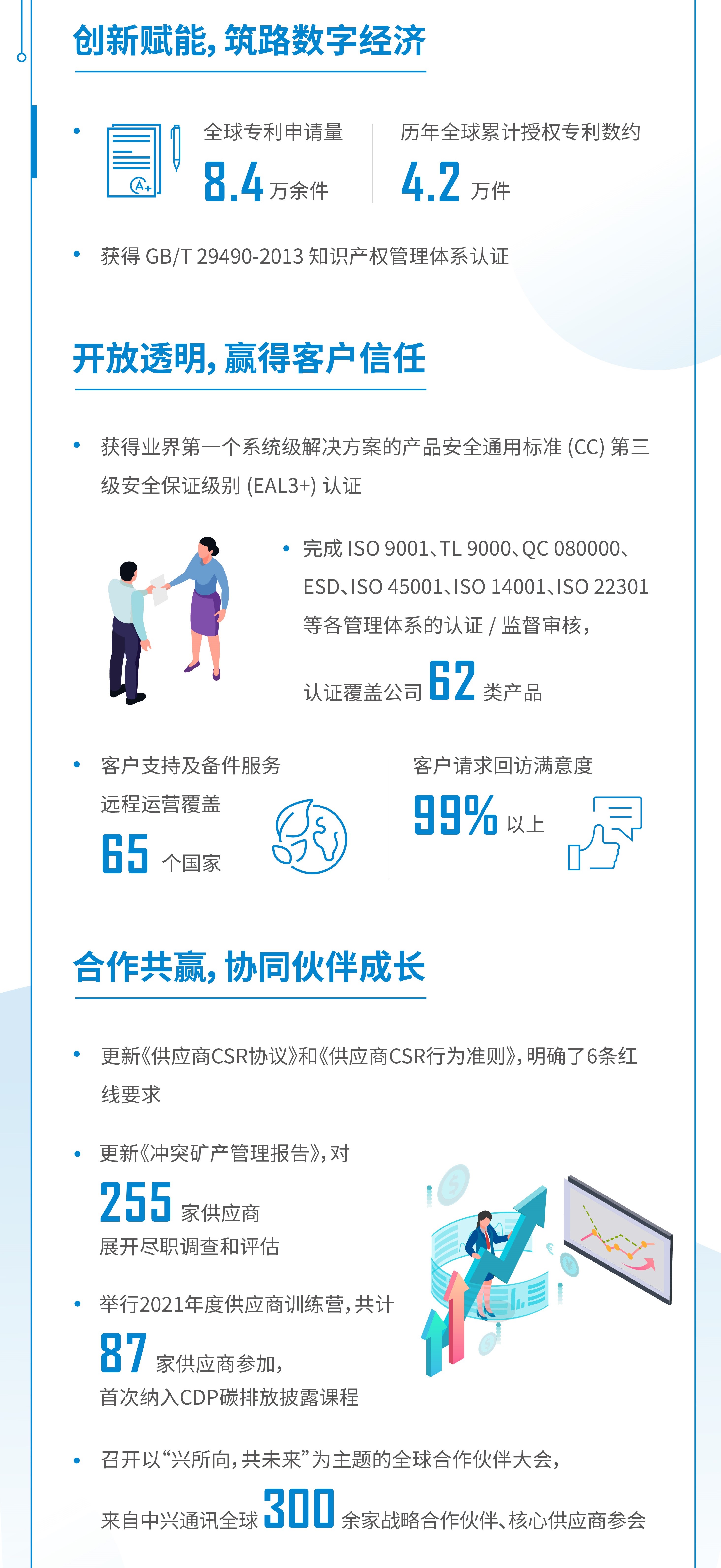 报告指出,在合规经营方面,中兴通讯始终坚持诚信经营,将合规管控嵌入公司的各项业务流程,以建立与公司业务实践相一致的一流合规管理体系,与全球客户、供应商及其他业务合作伙伴一起实现可持续发展。