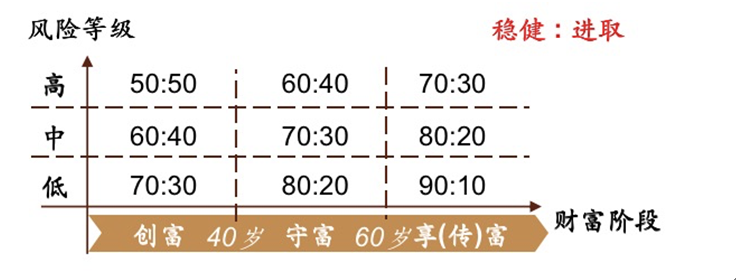 具体来看,第一个九宫格,横轴是客户的财富阶段,分为创富阶段、守富阶段、享富(传富)阶段三大阶段;纵轴是客户的风险等级,分为低、中、高三个级别,这样三个财富阶段、三个风险等级,就形成了九宫格。在这个九宫格里,会根据不同阶段、不同风险等级将客户稳健增值的钱与进取投资的钱做不同比例的分配。