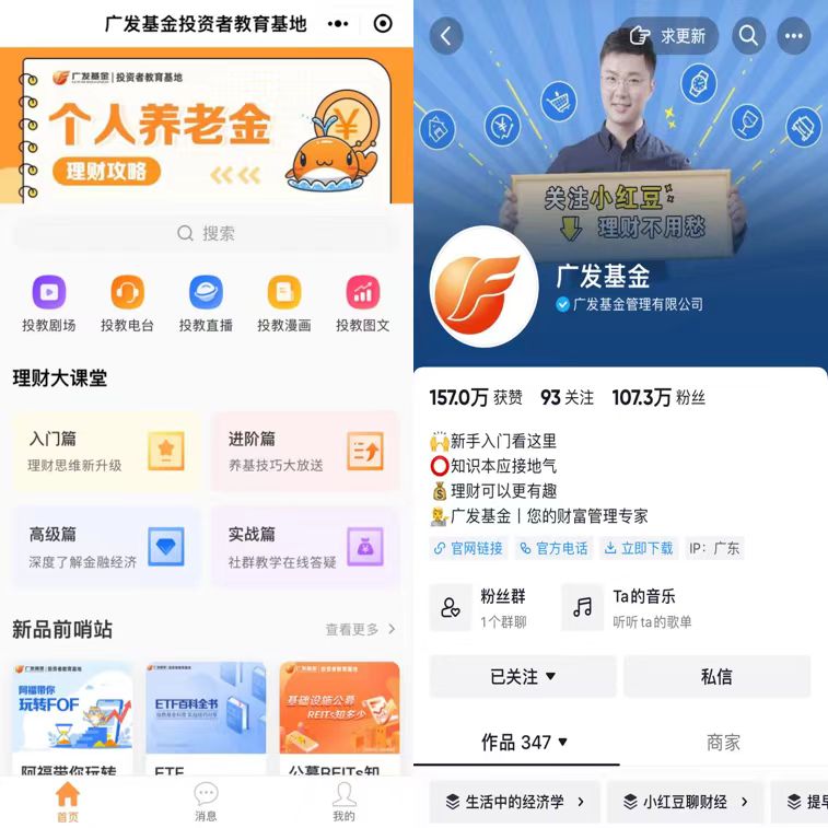 投资者能便捷地获取优质投教知识得益于广发基金有特色、成体系、差异化的多媒体矩阵和内容体系。截至目前,广发基金入驻了微信公众号、视频号、微博、抖音、今日头条等10大线上媒体平台,覆盖近千万投资者,其中今日头条、抖音等平台订阅人数均位列行业前茅。同时,面向理财新手,推出轻量级系列课程《年轻人的理财第一课》;聚焦女性群体理财需求,开发业内首部投教广播剧《财女养成计划》;针对养老投资服务需求,制作专题栏目《个人养老金知多少》《小红豆说养老》等。锚定不同投资知识背景、不同风险偏好的投资者提供精准、有针对性的陪伴。