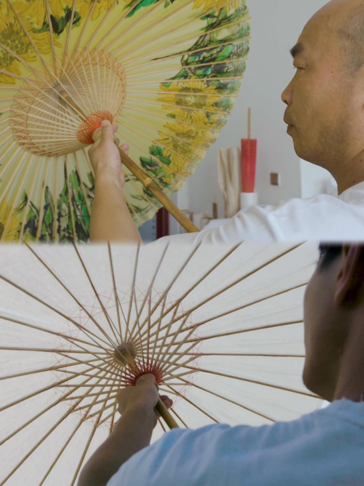 ▲周汉宇、周乐父子两代传承人通过油纸伞功能转型、拓展电商渠道等创新,让石鼓油纸伞走入更多消费者的生活。