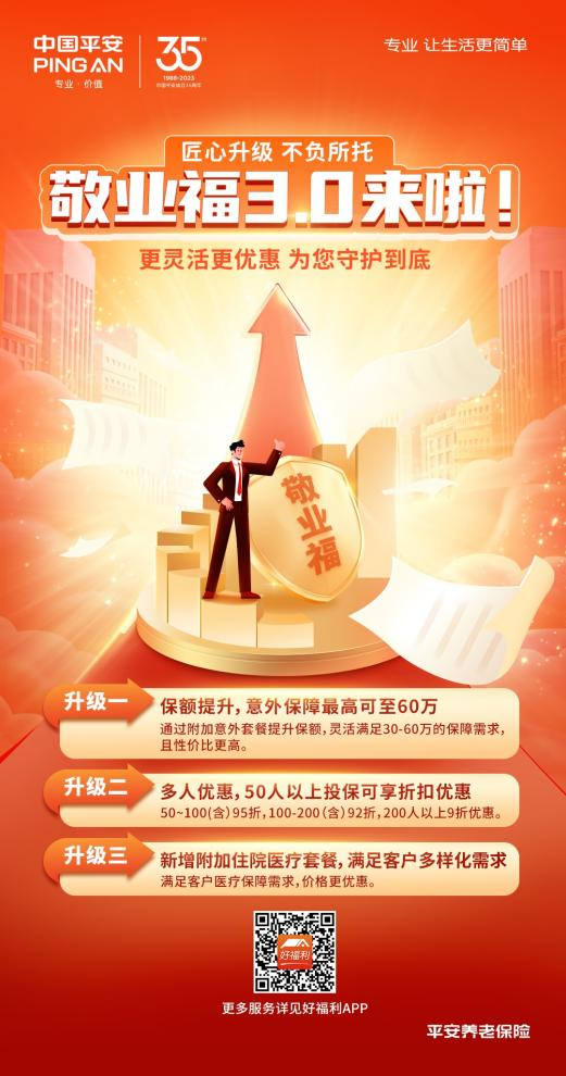 中小企业是产业升级的新生力量和吸纳就业的重要载体,也是受疫情冲击最大、困难最多的群体。面对小微企业当前的困境,平安养老险向广大中小企事业团体客户推出升级版“平安敬业福3.0”保险保障产品,在原有覆盖高额工伤意外身故、意外伤残、意外医疗和猝死责任的基础上,全面升级可选附加住院责任,为小微企业员工提供全面的风险管理保障方案。