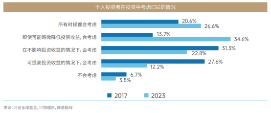 当问及个人投资者在什么投资情况中会考虑ESG时,61.2%的受访人表述在以下两种情况都会考量ESG因素:在所有时候都会考虑ESG因素;即使可能略微降低投资收益也会考虑ESG因素。而在2017年,同样的问题和选项,选择人数仅占34.3%。一定程度上,全面客观地评估投资的投资收益和社会效益是个人投资者ESG投资理念发展的趋势之一。