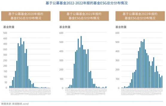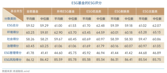 在数量规模增长之外,中国ESG基金的进化也体现在质量上。本报告基于过去三年公募基金的持仓股票的ESG评级,计算了公募基金的ESG绩效。我们发现,ESG基金的投资组合ESG绩效分数显著超越全市场平均水平。同时,随着上市公司ESG水平的提升以及越来越多的基金开始考虑ESG投资策略,过去三年中,全市场公募基金ESG绩效分数的中位数在逐步提升,或说明公募基金的整体ESG绩效正在逐步提升。