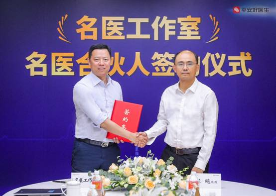 平安好医生临时董事长兼CEO方蔚豪(左)与同济大学附属第十人民医院程飚(右)教授在签约仪式上