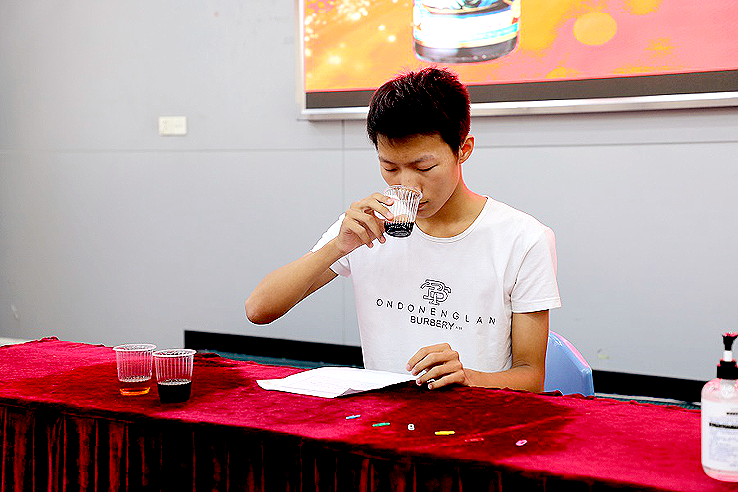 图为李锦记希望厨师粤菜师傅班面试现场,考生郭博扬正在进行嗅觉测试。