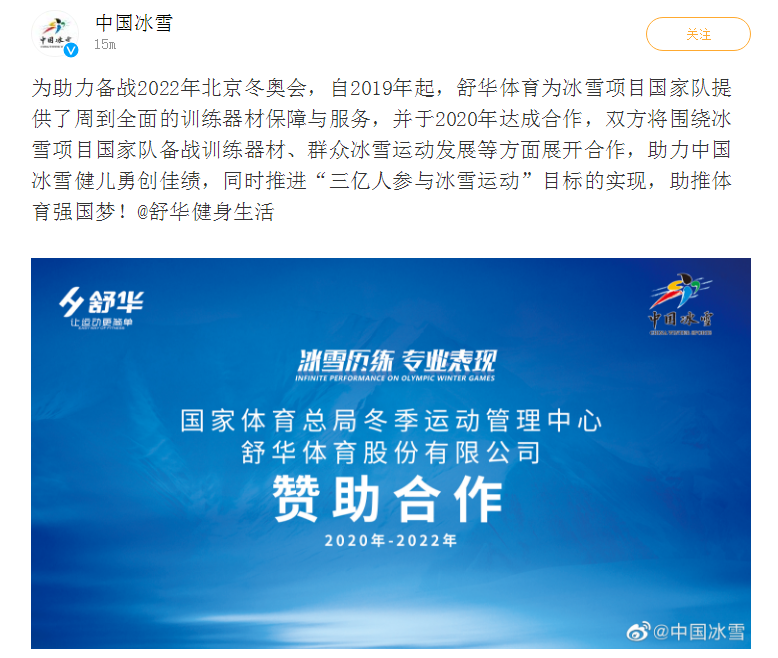 近日,国家体育总局冬季运动管理中心(简称“国家体育总局冬运中心”)宣布,舒华体育成为2020年-2022年国家体育总局冬运中心指定健身器材赞助商。