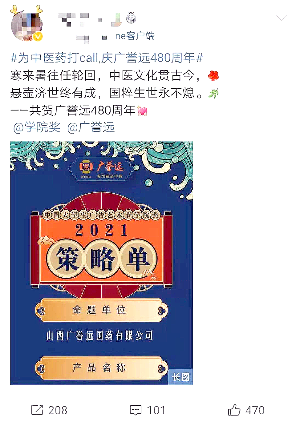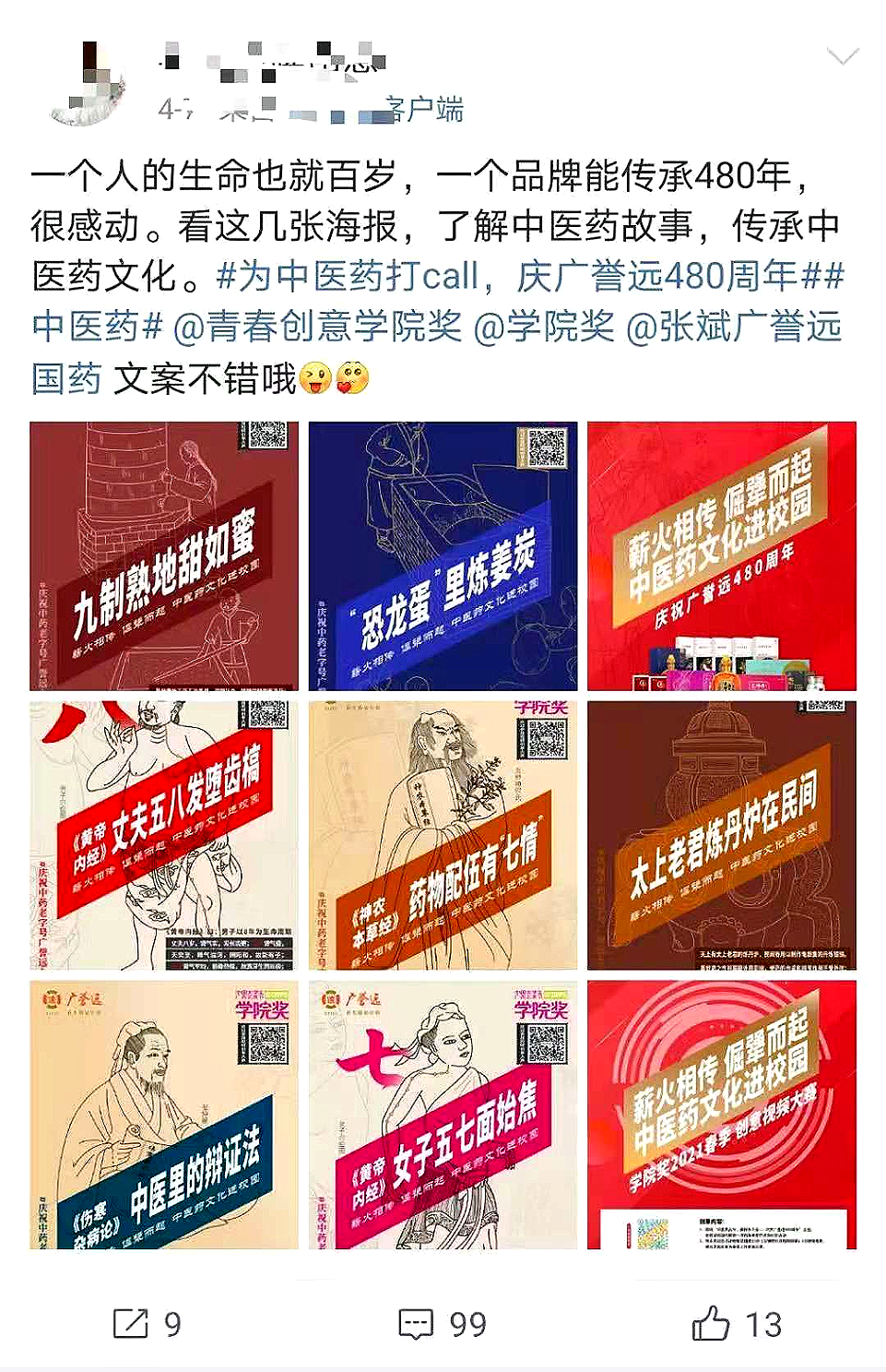 截至5月30日,由大学生发起的微博话题“为中医药打call,庆广誉远480周年”,阅读量已突破1000万人次,引起了社会各界的广泛关注。