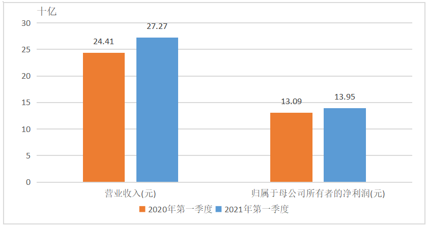 2021年一季度,茅台实现营业收入272.71亿元,同比增长11.74%;实现归属于母公司所有者的净利润139.54亿元,同比增长6.57%,茅台的企业实力已跻身全球烈酒市场领军企业阵营,业绩增速逐渐趋于稳定。
