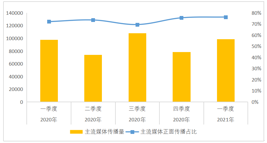 2021年一季度,按销售渠道看,茅台直销渠道收入47.78亿元,收入占比达到17.52%,较2020年全年13.96%的直销收入占比取得了大幅提升。这一变化与贵州茅台持续发力直销渠道,借助商超、电商平台等渠道直接面向终端消费者的动作相呼应。茅台品牌对消费者需求的重视,助力媒体评价持续提升,2021年一季度主流媒体正面传播占比稳定在76%。