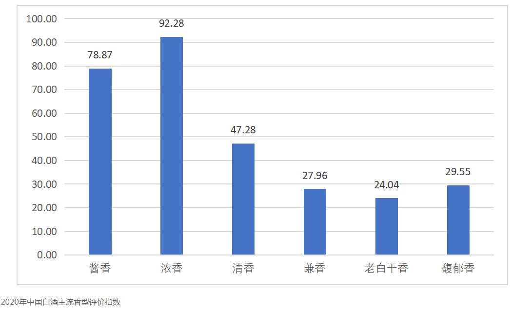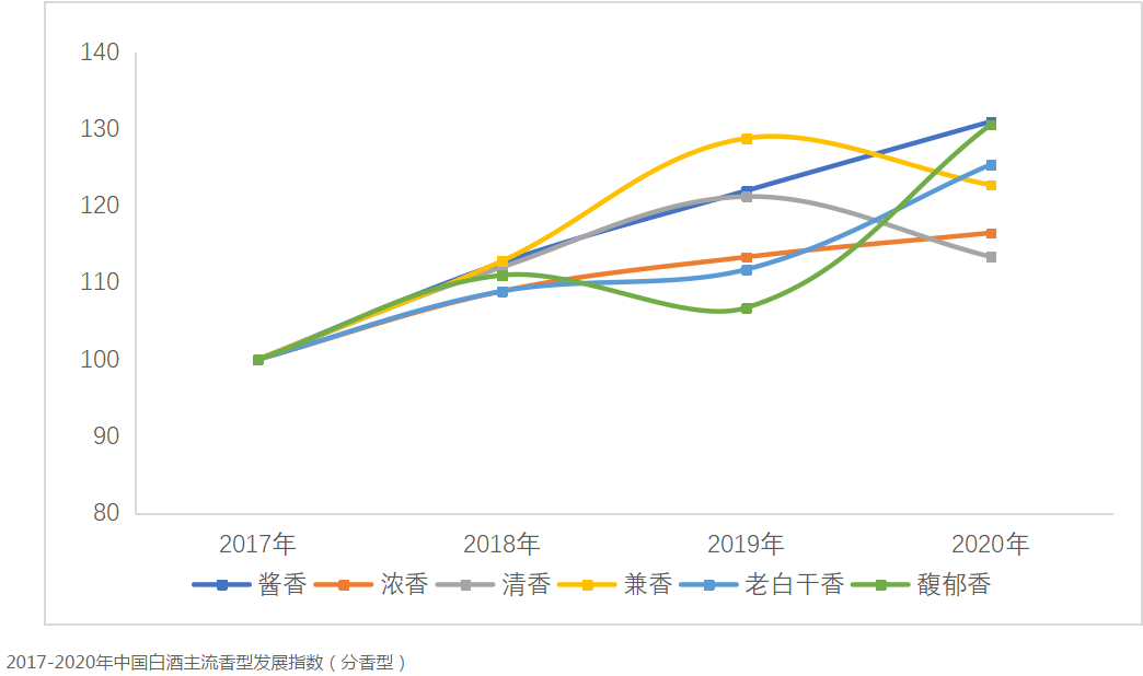 其中,中国白酒主流香型发展指数全方位评价了主流香型白酒的历史渊源、媒体关注、市场表现与消费者偏好,客观反映中国白酒市场的发展趋势。指数运行结果显示,2020年,浓香型、酱香型发展现状名列前茅,领先其他香型。2017年到2020年,各香型白酒整体呈增长态势,特别是2018年以来,各香型发展速度差异化逐渐加大,酱香型白酒长期稳步增长,年均增速领先。同时,2020年,酱香型白酒在包装、品牌、品质三个不同方面的满意度均大幅领先。