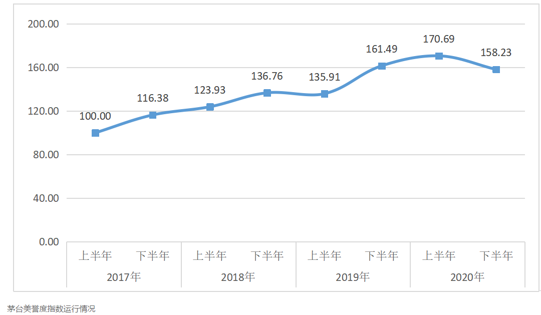 2020年,在疫情面前,茅台积极践行社会责任,捐款捐物,助力美誉度指数在2020年上半年达到峰值170.69点。随着舆论正面效应的释放,2020年下半年美誉度指数逐渐回归常态,与2019年同期水平基本一致,达158.23点。茅台持续多年坚持“大品牌有大担当”的责任观念,助力良好品牌形象持续传播。