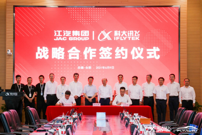 6月9日,科大讯飞股份有限公司(简称“科大讯飞)与安徽江淮汽车集团股份有限公司(简称“江汽集团”)在合肥签署了战略合作框架协议,科大讯飞董事长刘庆峰,江汽集团党委书记、董事长项兴初及双方集团公司的高管出席了签约仪式。