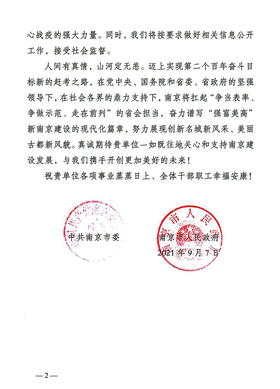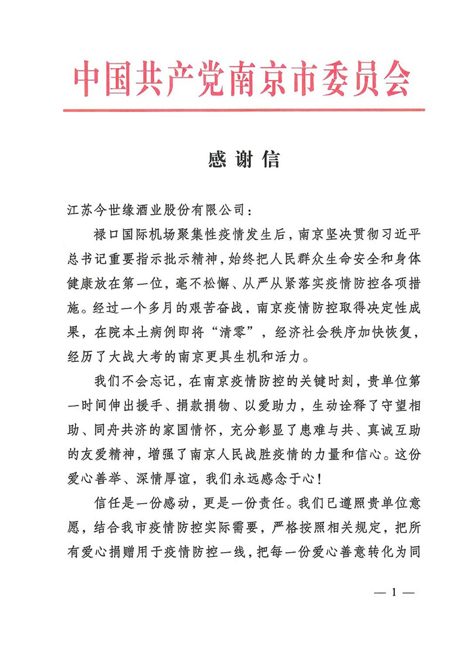 这是9月7日,中共南京市委、南京市人民政府给今世缘酒业的感谢信。信中对今世缘酒业助力南京疫情防控,捐款捐物的爱心善举表示感谢。