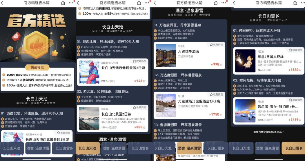 这些专题活动甄选优质商家,与其一起打造高品质的长白山旅行度假产品。通过权威的产品介绍,消费者得以更深入地了解长白山的旅游体验,并大幅降低了旅游消费决策成本。