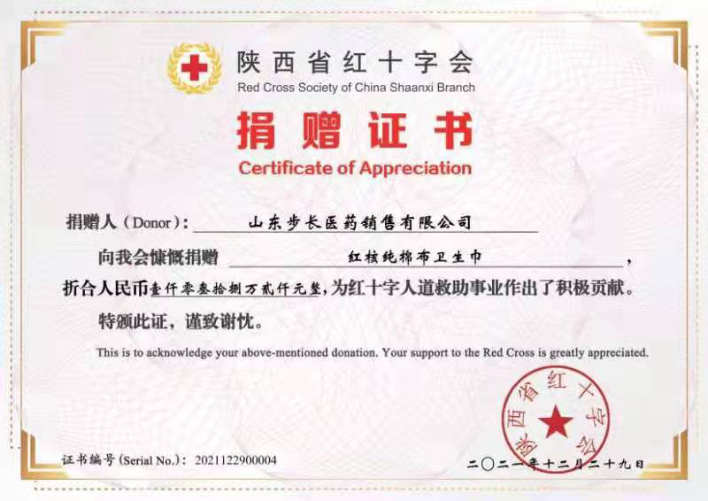 近日,西安市疫情防控形势日益严峻,步长制药看到这一情况后心急如焚,立即联系陕西省红十字会,表达了捐赠防疫物资的意愿。了解到抗疫队伍中的女性医务人员因不能及时更换生理期用品而承担着身心负担,步长制药紧急筹备了价值1038.2万元的质量过硬、吸水性强、无返渗、不侧漏、纯棉不过敏的抑菌型步长红核牌卫生巾(日用型+夜用型+加长夜用型),自愿捐赠给陕西省红十字会,定向用于西安市红十字会和西安相关医疗机构开展人道求助工作,用于疫情前线,为西安防疫工作者送去温暖,尽企业绵薄之力。