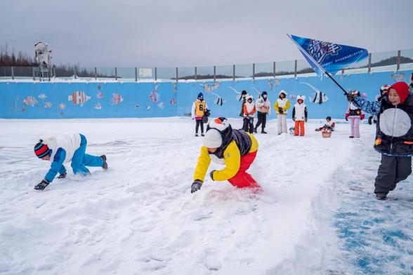 ↑滑雪训练营雪上行拓展训练:雪地爬走接力赛。
