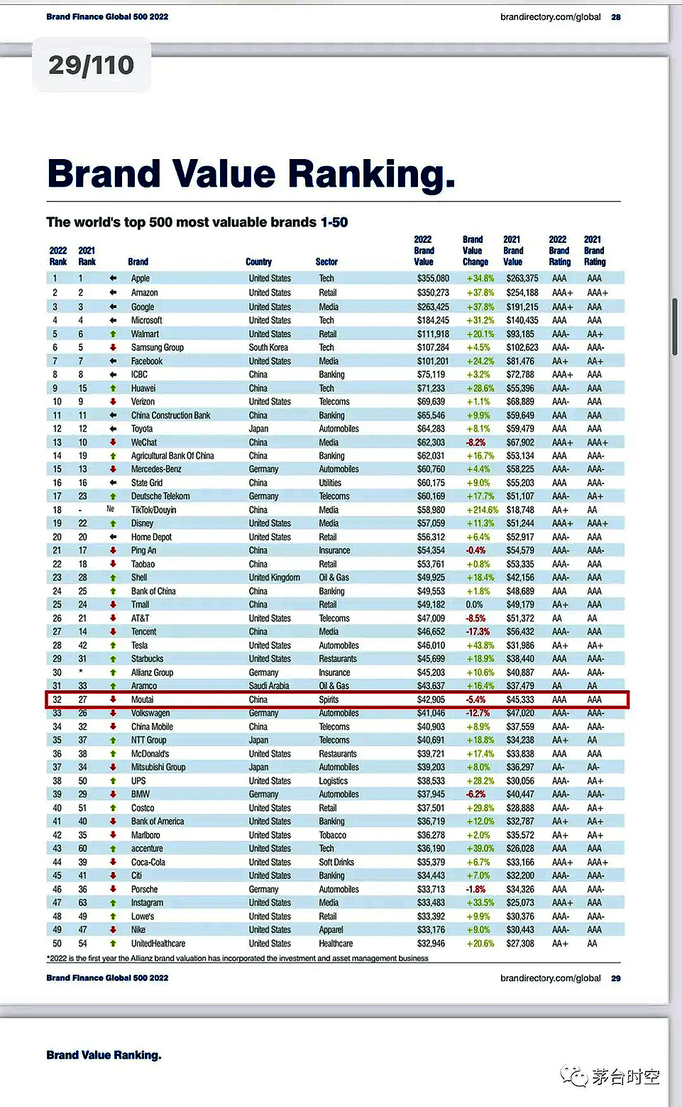 1月26日,知名品牌估值和战略咨询公司Brand Finance发布《2022年全球品牌价值500强》,茅台排名第32位,其品牌价值达429.05亿美元,获得 AAA的品牌评级,在全球酒行业排名第一,并与苹果、亚马逊、微软、华为、微信等知名品牌一道,跻身全球品牌价值前五十位的顶级阵营。