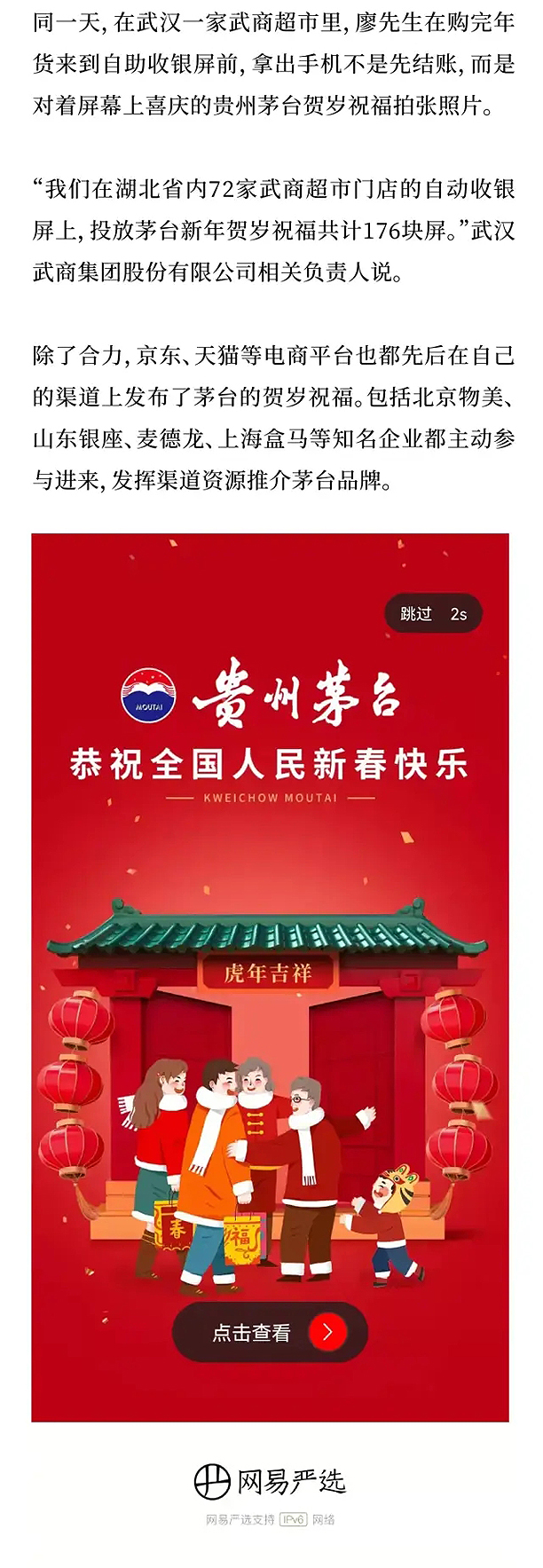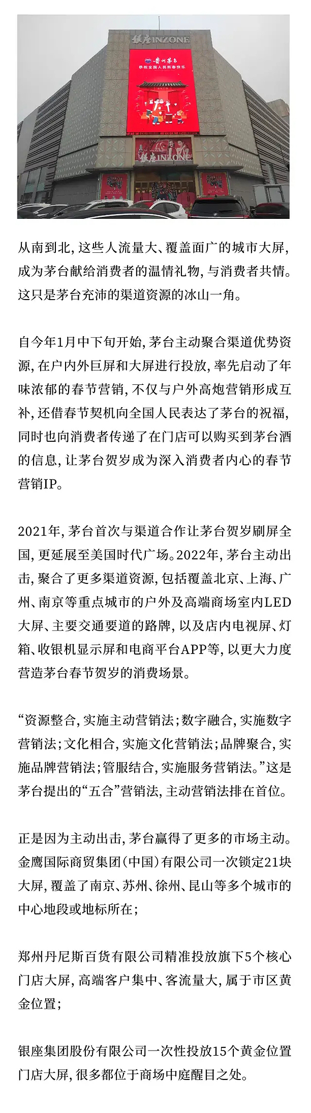 从杭州、广州、北京、上海到贵州,覆盖全国重点城市;从户外、高端商场大屏到店内电视屏、灯箱、收银机显示屏;从京东、天猫、网易等电商平台到电梯广告、展架等渠道自有媒体资源,覆盖全网人群……2022年春节将至,茅台贺岁再次在全国线上线下、大屏小屏联动刷屏,亲切传达节日祝福的同时,茅台节日营销的又一IP已悄然成型。