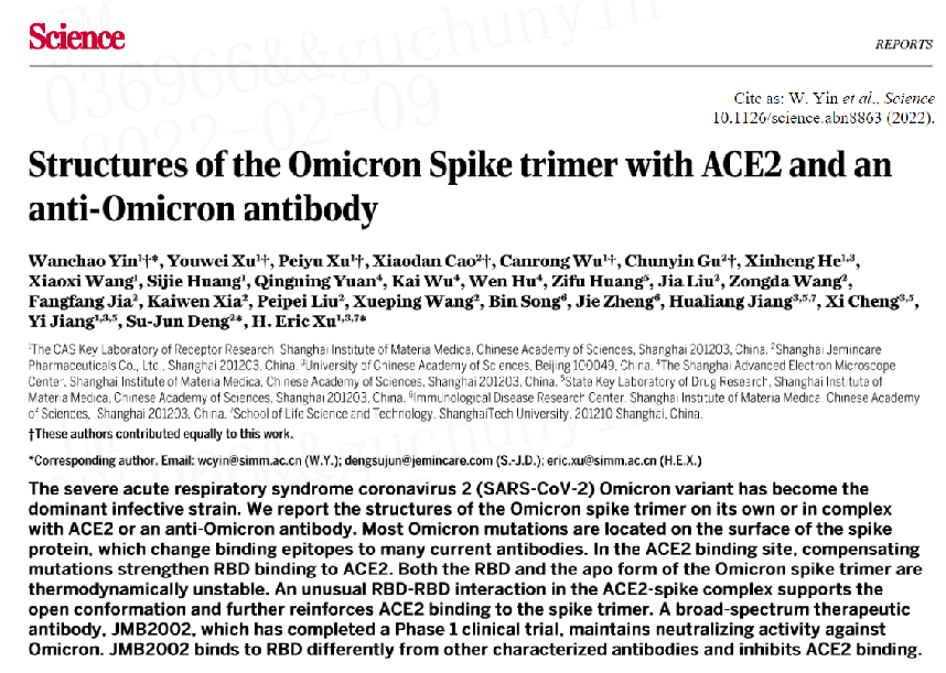 2022年2月8日,Science在线发表了中国科学院上海药物研究所徐华强教授/尹万超博士团队与济民可信邓俗俊博士团队合作的题为“Structures of the Omicron spike trimer with ACE2 and an anti-Omicron antibody”的最新成果(刊出地址:https://www.science.org/doi/10.1126/science.abn8863)。该研究解析了Omicron刺突蛋白与人源受体ACE2或广谱抗新冠抗体JMB2002复合物的高分辨冷冻电镜结构,阐述了Omicron变异株传播迅速和免疫逃逸的分子机制,并揭示了治疗抗体JMB2002全新的作用机制,为JMB2002对新冠病毒Omicron变异株仍具有中和功能及进一步开展临床试验研究提供了理论基础。为广谱抗新冠抗体的研发提供了新的思路,也可为全球新冠疫苗研发提供新的参考。