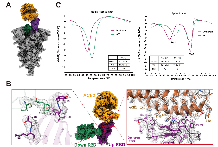 研究者发现Omicron刺突蛋白结合其受体ACE2相比于野生型提高6-9倍,通过解析Omicron变异株刺突蛋白与人源受体蛋白ACE2复合物的高分辨率冷冻电镜结构(图1A),从结构中观察到Omicron刺突蛋白三聚体相邻的RBD存在相互作用(图1B),利于Omicron刺突蛋白的RBD持续处于开放状态,增强了Omicron变异株的传染性;结合热动力学实验发现Omicron刺突蛋白的RBD高度灵活且不稳定,其热溶解温度降了超过5 °C(图1C),使得刺突蛋白更容易从闭合构象向开放构象转换,进一步增强Omicron变异株的传染性。简而言之,Omicron刺突蛋白RBD的相互作用及不稳定性,促进Omicron刺突蛋白与ACE2的相互作用,从原子水平解释了Omicron变异株传染性增强的潜在机制。