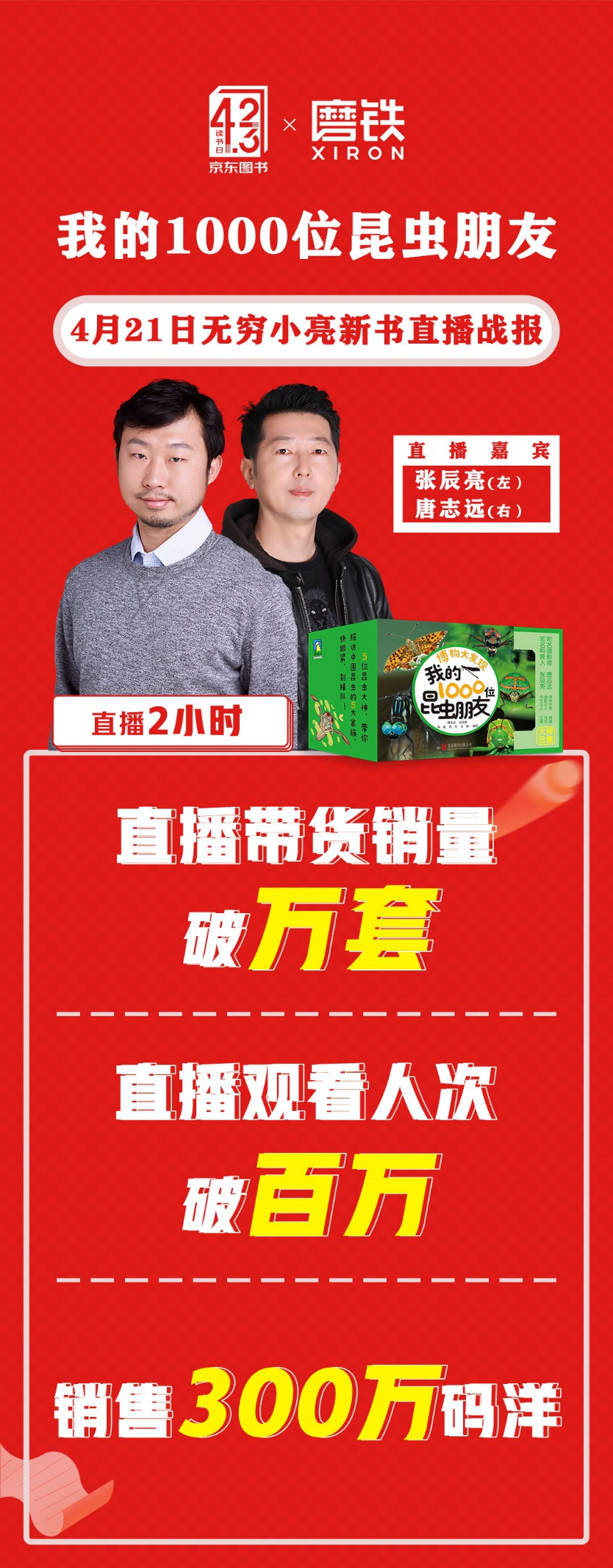 在直播带货成为图书销售新趋势的情况下,4月21日,京东图书邀请知名科普作家无穷小亮、唐志远来到直播间,两个小时逾百万人观看,售出新书《我的1000位昆虫朋友》逾万套。4月23日,京东图书更是开启了12小时不NG的大咖直播。吴军、杨红缨、严伯钧、马家辉、梁晓声、白茶、周国平等携新书直接面对读者,实现了很好的销售。