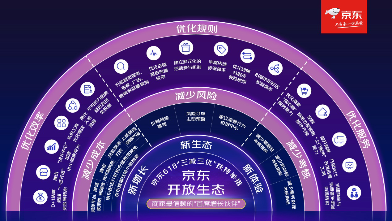 据辛利军介绍,京东618将通过30项“三减三优”商家扶持举措,即“减少成本、减少考核、减少风险、优化规则、优化效率、优化服务”,为商家构建新生态、打造新体验、开启新增长。
