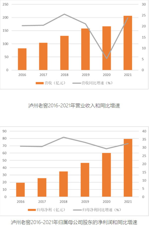 浓香鼻祖,“王者”归来。4月28日,泸州老窖发布2021年年报显示,报告期内,公司营收206.42亿元,与上年同期相比增长23.96%;归属于上市公司股东的净利润79.56亿元,同比增长32.47%。这是泸州老窖年营收首次突破200亿元,净利增速连续7年保持在30%左右。同时,泸州老窖披露2022年一季度报告显示,报告期内公司营收63.12亿元,同比增长26.15%;净利润28.76亿元,同比增长32.72%。