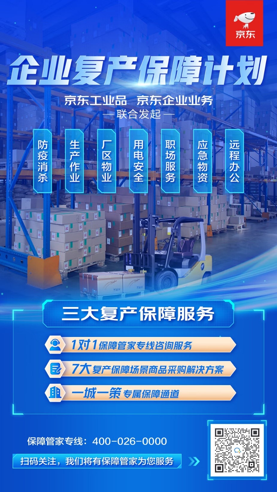 京东工业品与京东企业业务联合发起企业复产保障计划,针对企业防疫消杀、应急物资、劳动保护、职场服务等需求,提供一站式复产保障套餐,整合企业复产所急需的数十万SKU商品,并为企业提供小额免息资金的支持及企业管家专属服务,帮助企业构建覆盖全国的商品寻源、履约交付能力,实现资源更好盘活,产业链各环节间互联互通、高效协同。在上海,4月1日至30日,京东工业品为能源、汽车制造、电子制造、工程建筑等超50个行业600余家政企客户寻源履约交付超650万件物资,为企业保障复工物资供应。同时,京东将与上海金山园区等全国多个城市园区合作,通过智能无人配送车提供无接触配送等,为园区企业提供全面复产保障。