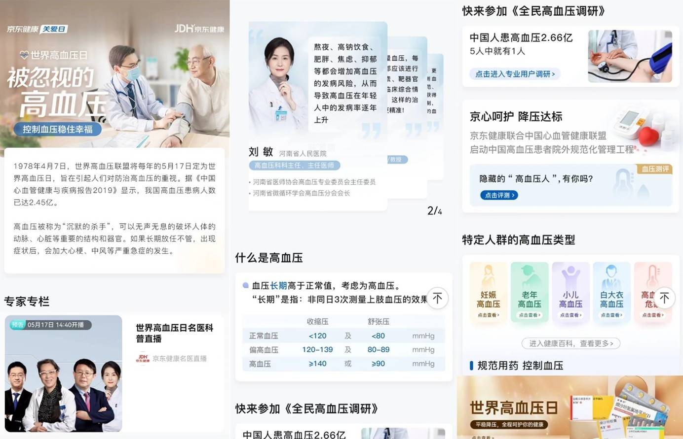 在本次世界高血压日,京东健康携手中国心血管健康联盟上线了“被忽视的高血压”专题页面,为用户提供高血压知识科普、推荐规范用药等服务,助力高血压患者进行院外自我管理。用户还可进行高血压风险评测,提前评估自身高血压患病风险。