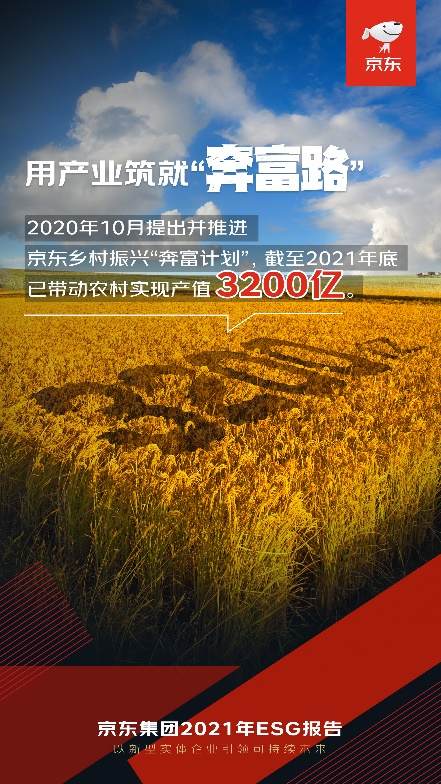 2020年10月,京东提出并持续推进乡村振兴“奔富计划”,至2021年底已带动农村实现产值3200亿,帮助数百万农户大幅增收。