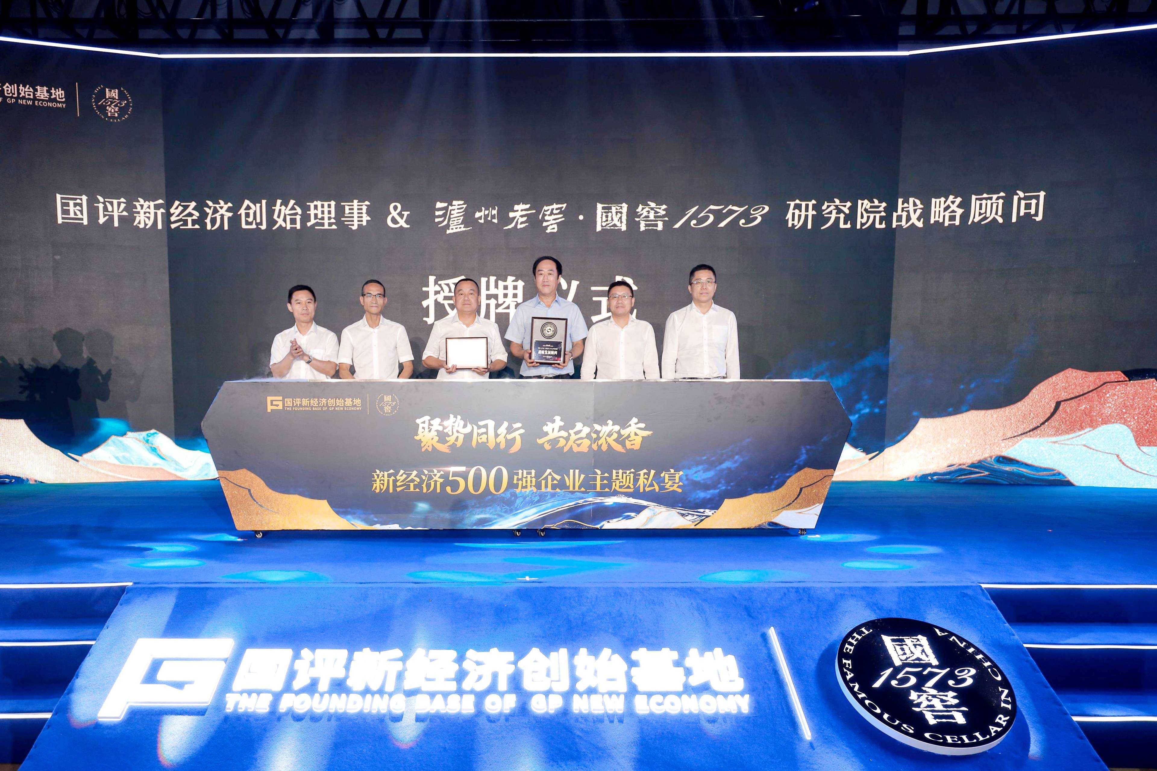 随后,与会嘉宾参加了“聚势同行,共启浓香”新经济500强企业主题晚宴。晚宴上国评新经济创始基地与泸州老窖隆重举行授牌仪式,国评新经济创始基地为刘淼颁发国评新经济创始基地创始理事证书,泸州老窖为刘晓明颁发泸州老窖·国窖1573研究院战略发展顾问聘书。双方将会在未来发展中加强合作,携手共进,相互助力,共同发展。