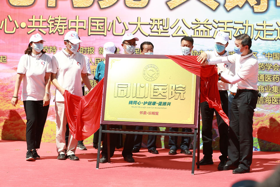 在揭牌及捐赠仪式上,清华大学第一附属医院党委书记类延旭、中国康复研究中心副院长张通、航天总医院副院长原永平、北京中医药大学第三附属医院常务副院长徐峰、北京市回民医院书记朱刚,以及北京王府中西医结合医院院长王耀辉共同为“同心医院”揭牌。