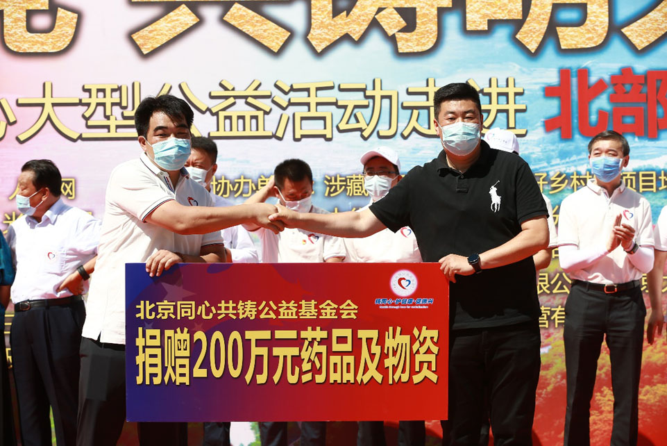 随后,同心共铸基金会秘书长殷延志代表基金会为本次公益活动捐赠价值200万元的药品及爱心物资,并为持续坚守在抗疫一线的村民志愿者捐赠新冠预防药品“宣肺败毒”颗粒。