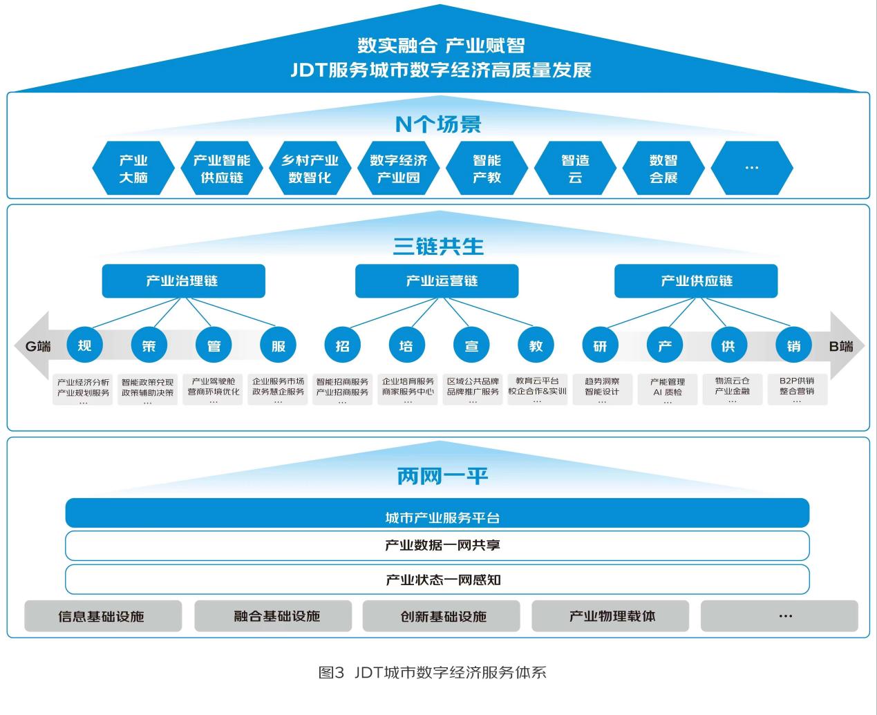 白皮书显示,JDT城市数字经济“两网一平、三链共生”服务体系的“两网”是依托产业级智能物联网服务平台构建产业感知体系,基于产业数据仓搭建产业数据资源体系,实现“产业状态一网感知、产业数据一网共享”;“一平”即京东科技利用新一代数智技术,面向城市产业发展场景打造城市产业服务平台,强化产业数智化技术与服务供给,实现“产业赋智”;“三链”是京东科技构建覆盖产业治理链、产业运营链、产业供应链的“三链共生” 服务体系,以数智技术提升城市产业治理能力、促进产业融合发展、推动产业链供应链变革,全方位助力城市数字经济高质量发展。