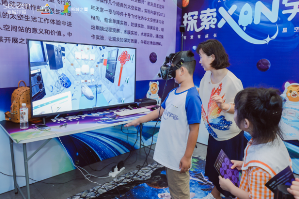 VR体验环节,设备前都排好了长队,小业主们感受着科技的魅力、仿佛进入真实的太空舱,体验太空舱的环境,完成太空舱里面的小实验。