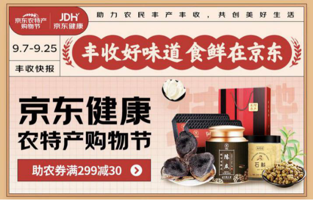 为积极响应国家举办“中国农民丰收节”的号召,首届“京东农特产购物节”于9月7日开幕,首届“京东健康农特产购物节”也于当日同步开启。